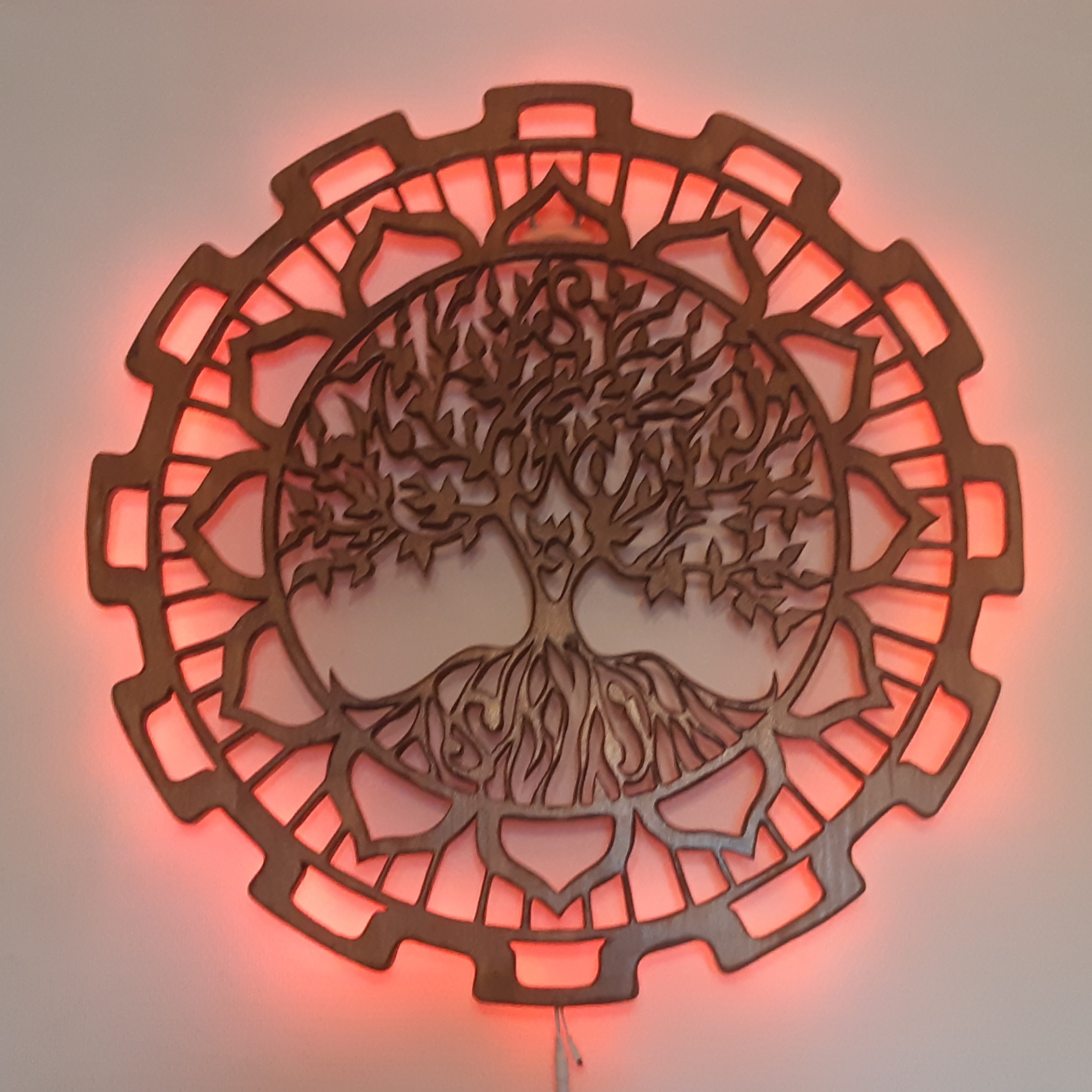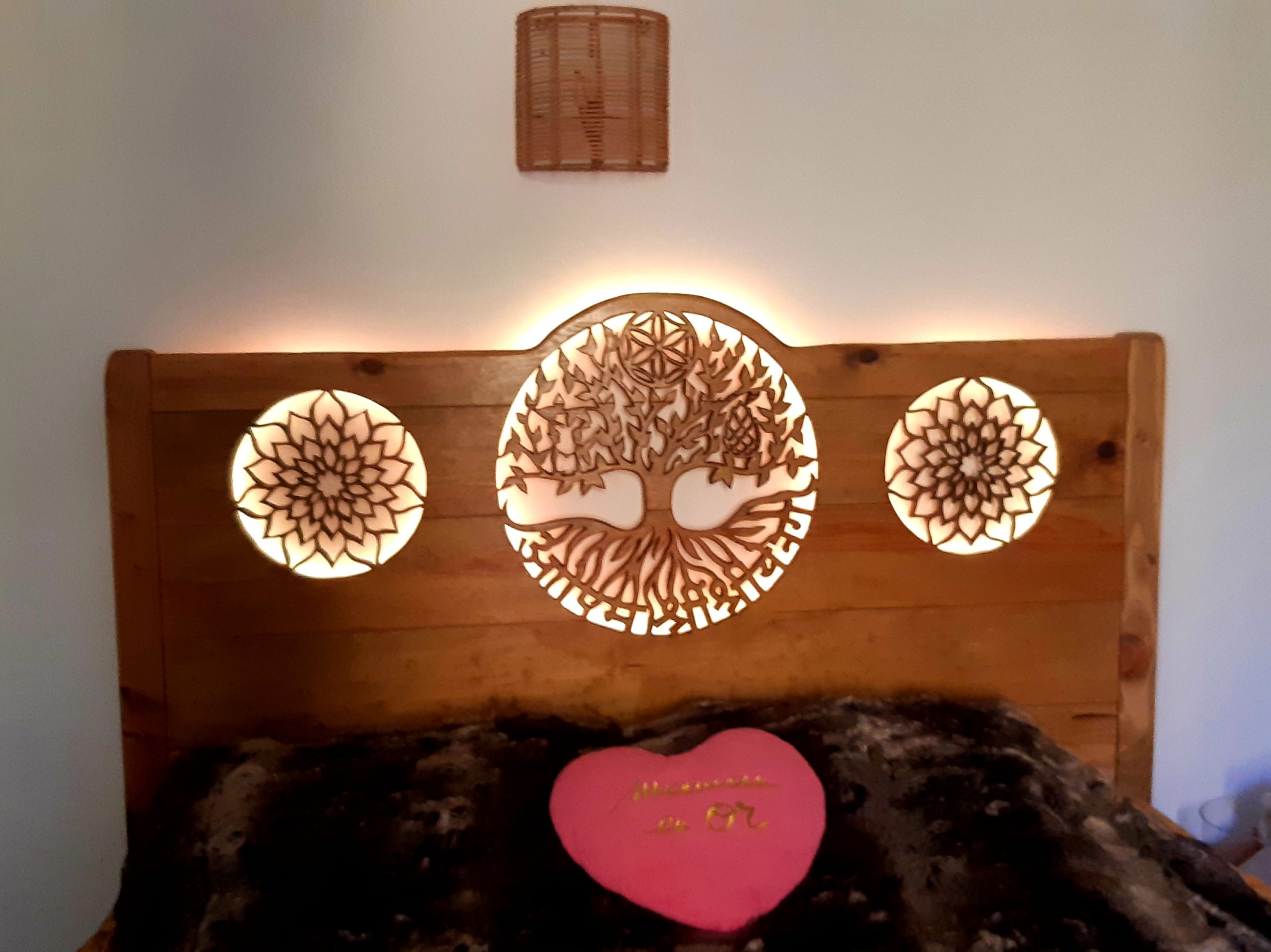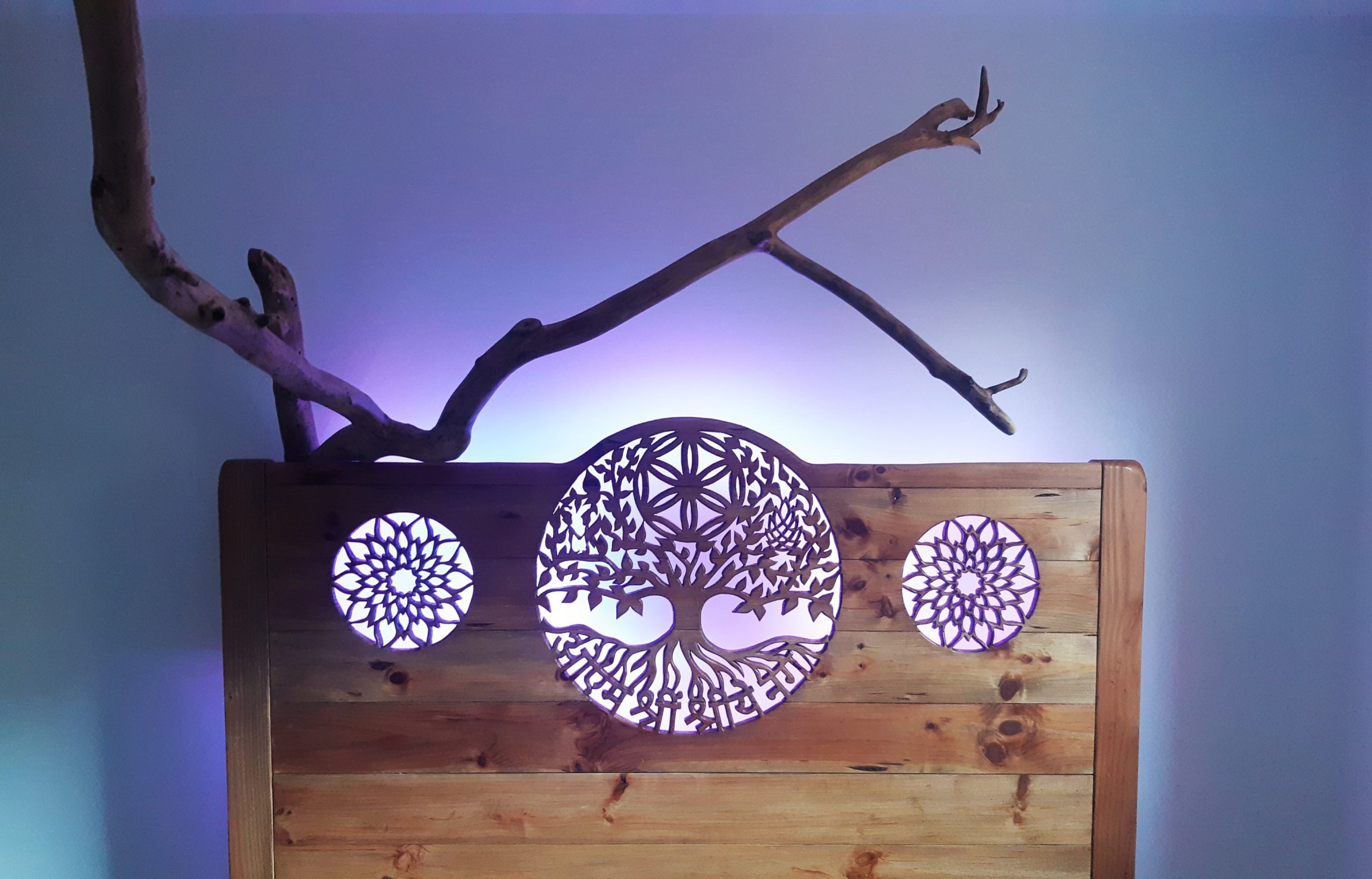 Every hanging wall art creation is 100% hand-made and is available in various sizes, contrasting colors and natural wood shades with optional RGB/white LED light. Buying your wooden flower mandala or headboard is tricky — absolutely all of them are eye-catching and make your interior uniquely mysterious, no matter if you place it in the bedroom, office or over a massage table in your studio.